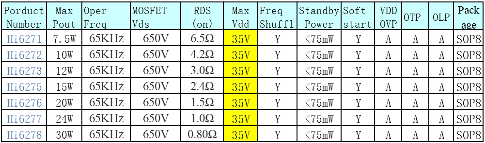 Hi6271至Hi6278:這些型號的輸出功率從7.5W到30W不等,適用于中等功率需求的應用。它們都采用了SOP8封裝,便于集成到各種電路設計中。