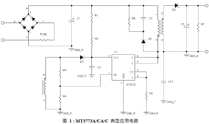 MT3773系列芯片采用脈沖頻率調(diào)制(PFM)技術(shù),建立非連續(xù)導(dǎo)電模式(DCM)的反激式電源,內(nèi)置準(zhǔn)諧振(QR)模式,能夠?qū)崿F(xiàn)高效率的電能轉(zhuǎn)換。其典型應(yīng)用電路如下: