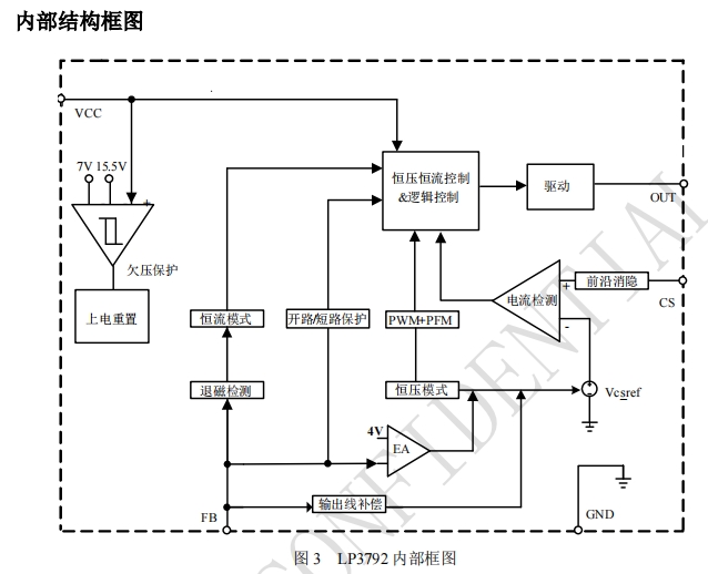 在恒壓模式下,LP3792通過采樣輔助繞組的平臺電壓,并與內部基準電壓進行比較,形成閉環控制,從而精確調節輸出電壓。其恒壓精度高,能夠確保輸出電壓在各種輸入電壓和負載條件下的穩定性。在恒流模式下,芯片逐周期檢測電感的峰值電流,并通過CS端與內部閾值電壓進行比較,當達到設定閾值時關斷MOS管,實現精確的恒流控制。這種高精度的控制方式對于需要嚴格控制充電電流的設備,如手機、平板電腦等,至關重要,能夠有效保護電池,延長其使用壽命。