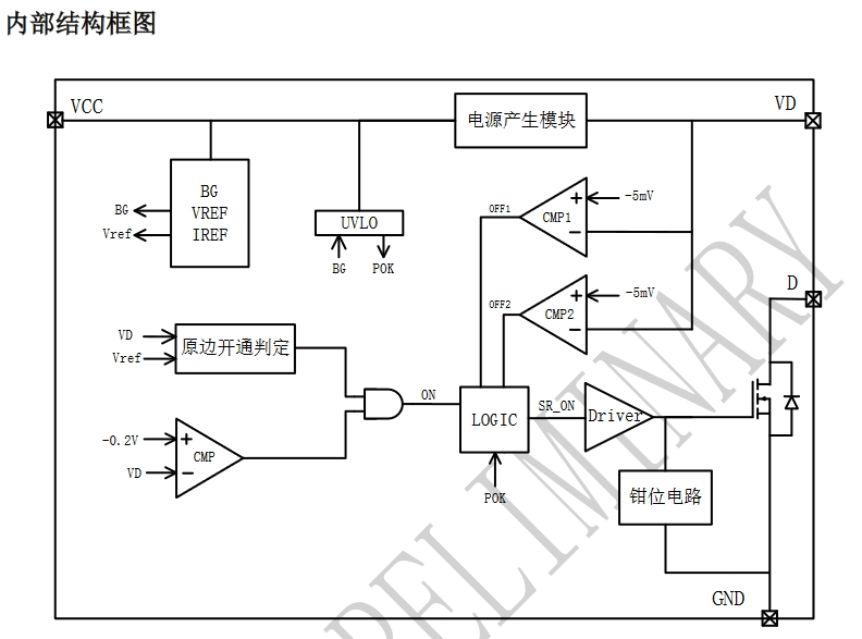 輸出下端:VCC欠壓保護和過壓鉗位功能通過VD腳的分壓實現,保護同樣有效。