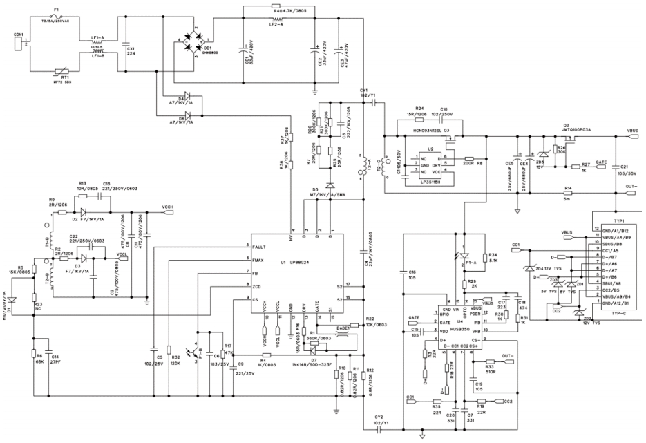在這一背景下,芯茂微電子憑借其在電源管理芯片領域的深厚技術積累和創新能力,推出了合封氮化鎵LP88G24DCD的PD65W適配器參考設計。這一設計充分展現了GaN技術的優勢,同時也體現了芯茂微電子在電源管理芯片設計上的先進理念。