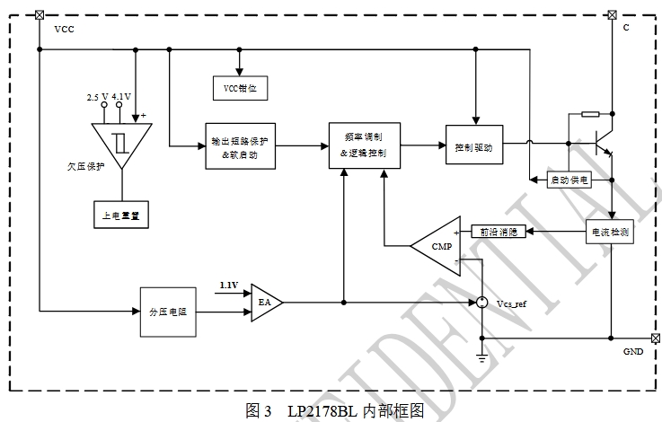 LP2178BL的啟動過程非常簡潔。芯片僅需1uA的啟動電流,系統上電后,通過內部啟動供電電路對VCC的電容進行充電。當VCC電壓達到芯片開啟閾值時,內部控制電路開始工作,輸出電壓開始上升并建立。在輸出電壓穩定后,VCC由輸出電壓供電,確保系統的持續運行。