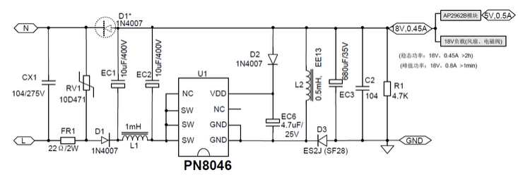 PN8046芯片的典型應(yīng)用包括18V/0.45A智能家電電源方案。該方案基于雙路18和5V,輸出非隔離開(kāi)關(guān)電源,使用Chipown設(shè)計(jì)研發(fā)的離線式集成電源控制芯片PN8046。輸入電壓范圍為90~265V,輸出功率≤8.1W,輸出電壓為18V,輸出電流為0.45A,效率高達(dá)78%。