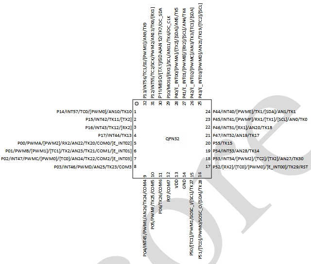 AiP8F3532 提供了多種封裝形式,包括 SOP32、SOP28、LQFP32 和 QFN32 等,以滿足不同用戶的需求。以下是其中幾種封裝形式的引腳排列圖: