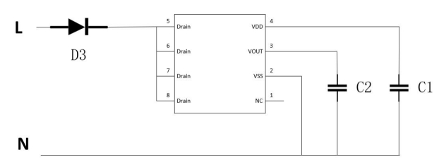 5,6,7,8Drain電源內部功率MOSFET漏極,為VDD供電