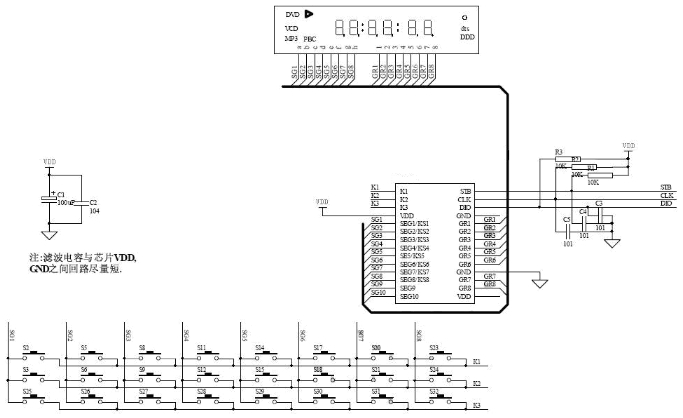 MCU數字接口:包括CLK(時鐘輸入)、DIO(數據輸入/輸出)、STB(片選)等引腳,用于與微控制器進行通信。