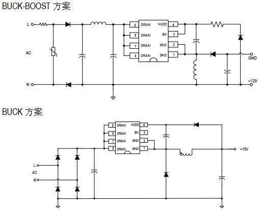 • 優勢:內部集成650V高壓功率管,內置CS電阻,無需外部補償元件,即可實現優異的線性調整率和負載調整率。不需要反饋環路,提高了集成度和系統可靠性。采用了抖頻和智能軟驅動技術,進一步優化了EMC性能。