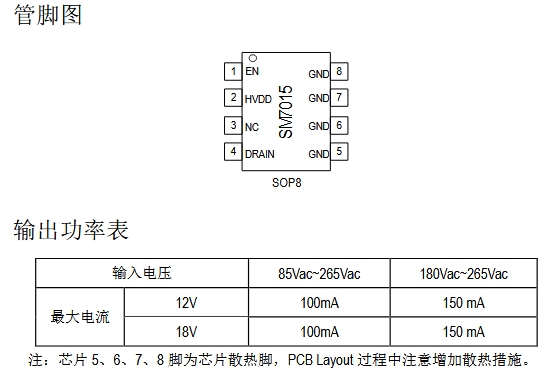 • SM7015:采用電流模式PWM控制方式,集成了高壓啟動電路和高壓功率管,適用于低成本開關電源系統,提供高性價比的解決方案。它支持12V/18V輸出電壓,應用于BUCK系統方案,具備完善的保護功能,保證系統可靠性。