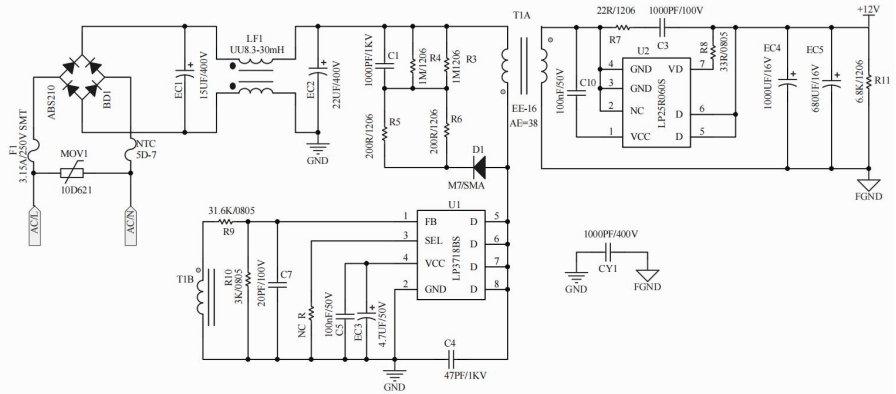 LP3718BS是一款高性能的PWM控制器,具備多種保護功能和調制方式。在本方案中,LP3718BS負責控制開關頻率、占空比以及實現過流保護、短路保護等功能。通過精確的控制算法,LP3718BS能夠確保電源在不同負載條件下的穩定輸出。電路圖如下所示~