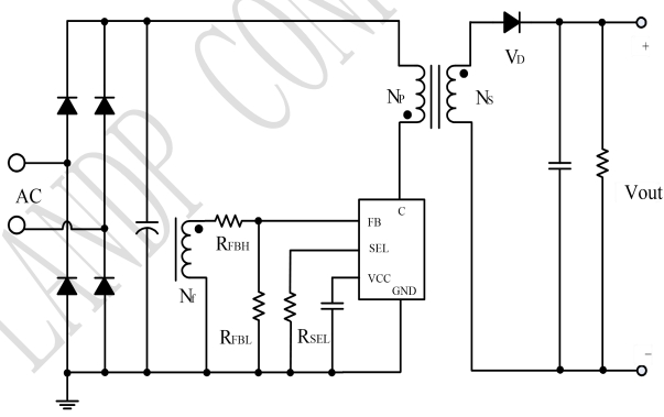 峰值電流設(shè)置通過SEL腳外接電阻RSEL實(shí)現(xiàn),可調(diào)最大峰值電流IPKMAX。恒流控制和輸出恒流電流設(shè)置通過檢測電感的峰值電流實(shí)現(xiàn),當(dāng)原邊電感中的實(shí)時(shí)電流大于芯片設(shè)定的最大峰值電流IPKMAX時(shí),功率管關(guān)斷。輸出電流IOUT與變壓器的匝數(shù)比、峰值電流和退磁時(shí)間等因素有關(guān)。