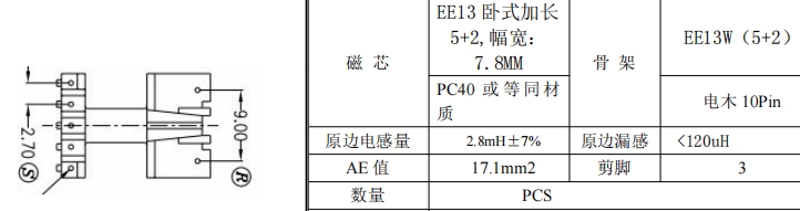變壓器采用EE13臥式骨架,關(guān)鍵參數(shù)如下: