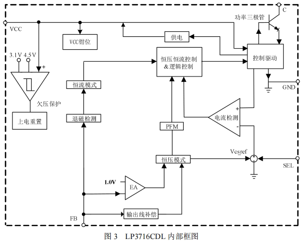 該框圖展示了芯片的主要功能模塊,包括功率三極管、VCC供電電路、恒壓恒流控制電路、保護功能電路等。通過這些模塊的協同工作,LP3716CDL能夠實現高效的電源管理和精確的輸出控制。