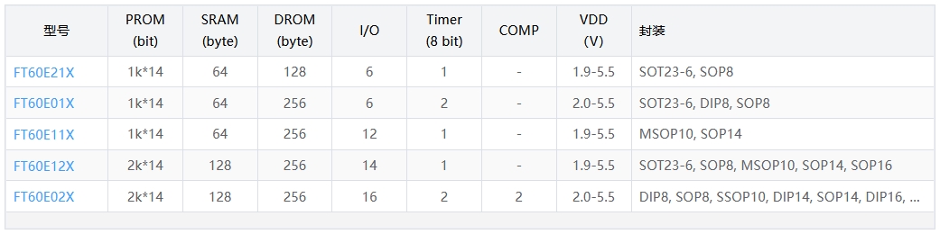 例如:FT60F21X ? FT60E21X,只是 DROM 擦寫壽命從 100 k 提升到 1 000 k,價格貴 3~5 分錢。