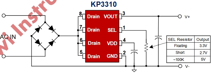 AC→保險(xiǎn)絲→整流橋→22μF/400V→KP3310SGA→47μF/10V→5V/30mA