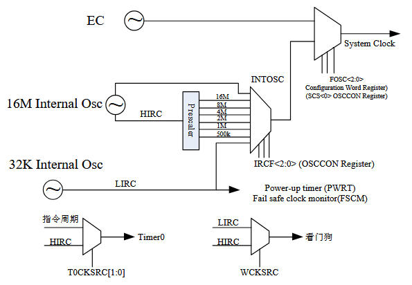 HIRC/LIRC → 時鐘選擇器 → CPU/Timer/PWM → GPIO → 外部世界
