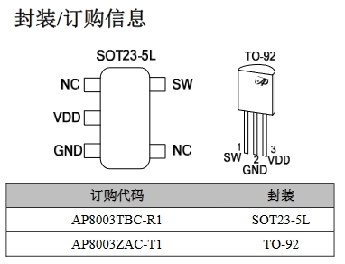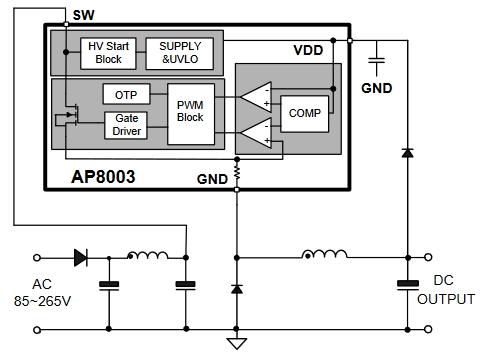 AP8003ZAC-T1集成PFM控制器及500V高可靠性MOSFET,用于外圍元器件極精簡的小功率非隔離開關電源。AP8003內置500V高壓啟動,實現系統快速啟動、超低待機功能。該芯片提供了完整的智能化保護功能,包括過載保護,欠壓保護,過溫保護。另外AP8003具有優異的EMI特性: