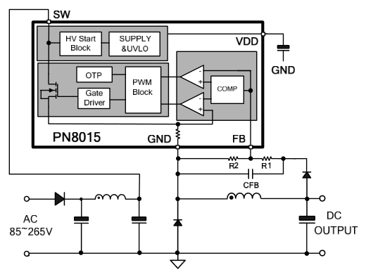 寬輸出范圍非隔離開關電源芯片—PN8015;產品特征:內置800V高雪崩能力智能功率MOSFET、高壓啟動和自供電電路、適用于Buck、Buck-Boost、Flyback等多種架構、輸出電壓3。3V-12V可通過FB電阻調整、半封閉式穩態輸出電流>200mA@230VAC、改善EMI的降頻調制技術、優異的負載高速率和工作效率、全面的保護功能。開關電源芯片—PN8015應用于:非隔離輔助電源、家電、智能家居等領域。