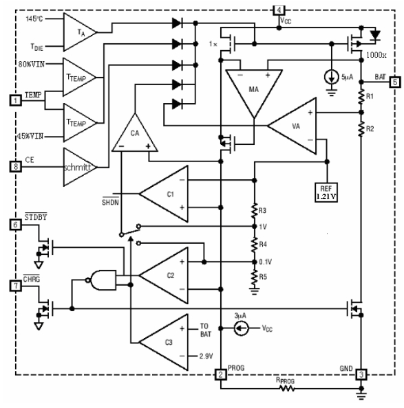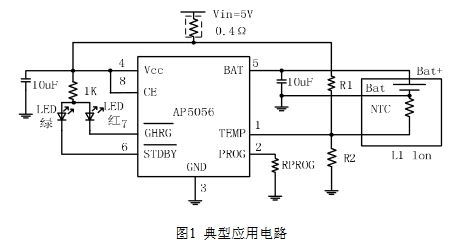 充電電壓被固定在4.2V,充電電流可通過外部電阻設置。當充電電流在達到最終浮充電壓之后降至設定值 1/10 時,AP5056 將自動終止充電循環。當輸入端(適配器或USB電源)拔掉后,AP5056自動進入低電流狀態,電池漏電流將降到2μA以下。AP5056還可被設置于停機狀態,使電源電流降到50μA。其余特性包括:電池溫度監測,欠壓鎖閉,自動再充電和兩個狀態引腳以顯示充電和充電終止。