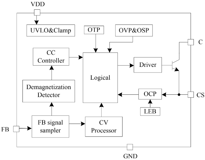 PL3368C(x)是一系列原邊控制,用于反激式開關電源的恒流/恒壓調節器。其高度集成了功率開關,并通過去除光耦以及次級控制電路,在簡化充電器/適配器等傳統的恒流/恒壓設計的同時實現了精確的電流和電壓調節,內部框架圖如下圖所示