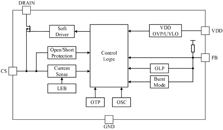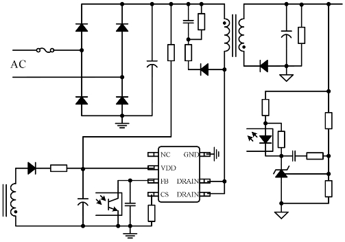 芯片通過對輸出采樣并反饋到光耦獲得高精度的恒壓輸出。內置的斜率補償電路確保了峰值電流??刂频姆€定性。內部集成的頻率抖動功能可以改善EMC,降低EMI濾波成本。