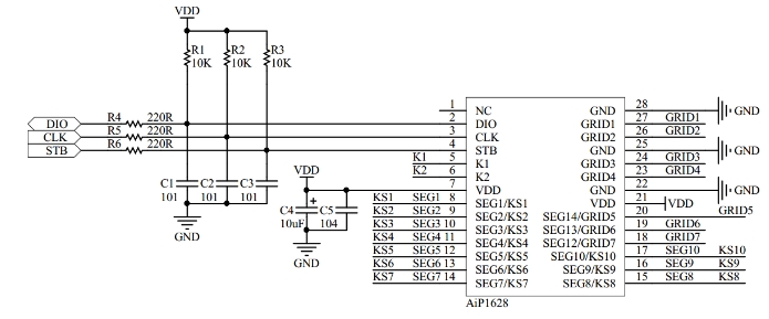 AiP1628是帶鍵盤掃描接口的LED驅動控制專用電路,內部集成有MCU數字接口、數據鎖存器、鍵盤掃描等電路。本產品主要應用于VCR、VCD、DVD及家庭影院等產品的顯示屏驅動。