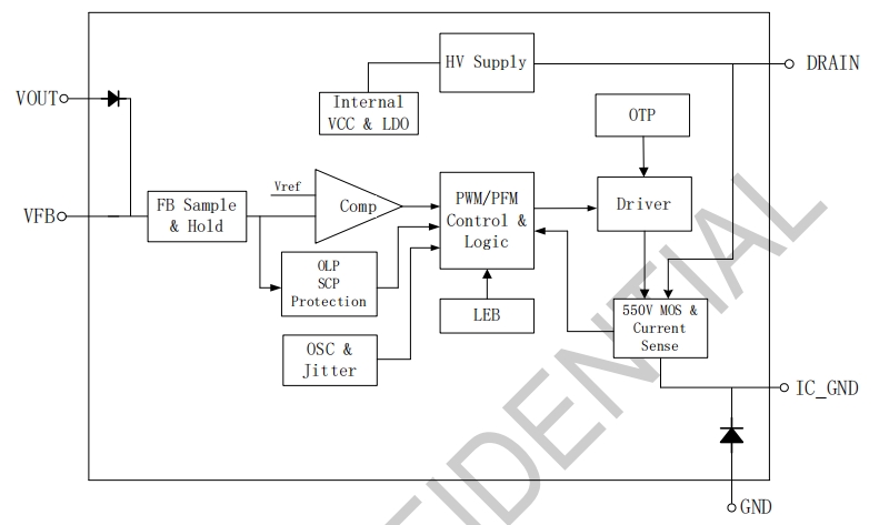 集成550V MOSFET:內部集成的高壓MOSFET減少了外部元件的需求,簡化了電路設計。