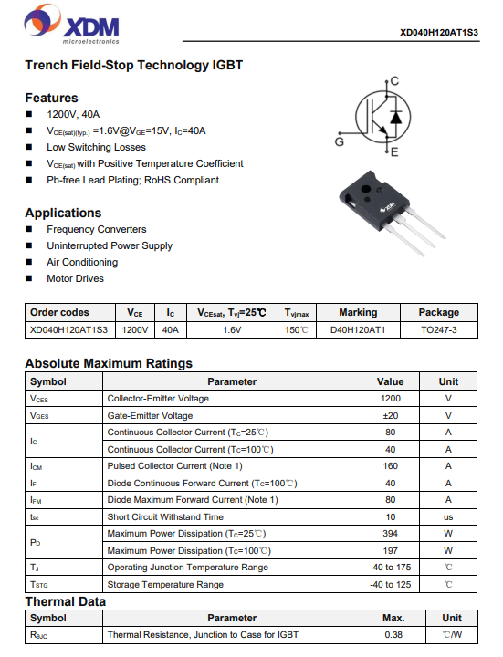 芯達茂XD040H120AT1S3國產IBGT +FRD單管 40A 1200V TO-247-3L